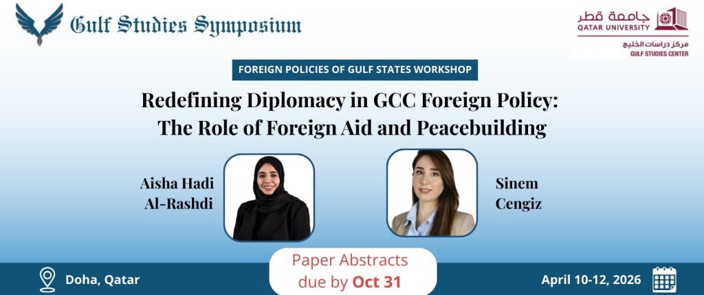 - To co-chair a workshop titled: “Redefining Diplomacy in GCC Foreign Policy: The Role of Foreign Aid and Peacebuilding” with Dr. Aisha Alrashdi at Third Gulf Studies Symposium to be held in Doha in April 10-12, 2026